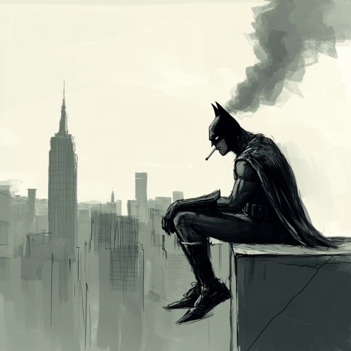 cartoon drawing style. A sleathy, 15ft tall mech wearing a black cloak that is made of linked, black hexagons. The mech is very sleek and is dark grey with green highlights. The face is angular and has a singular line representing eyes. The mech is squatting on rocky mountain ledge.