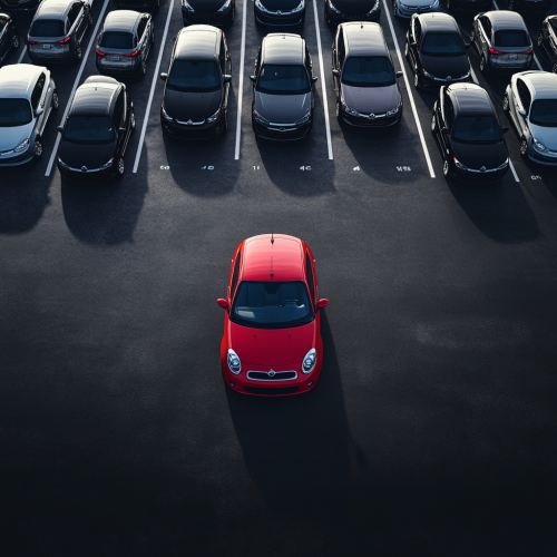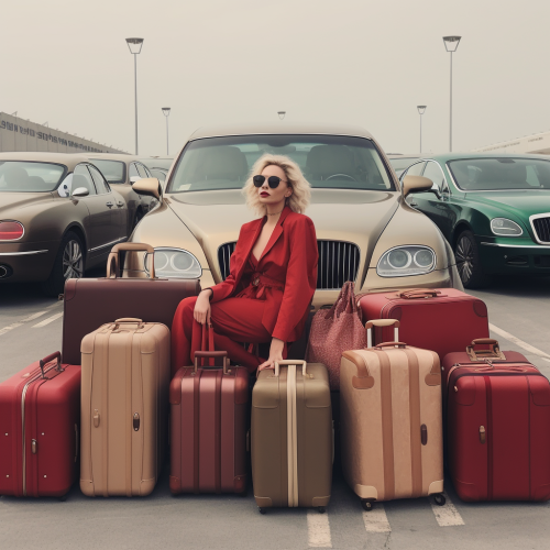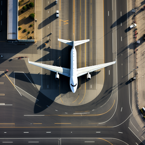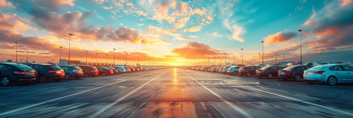ow wide angle perspective of a huge airport parking lot seen for a low point of view. there is a light blue and orange sunset. the cars are mid to high range. the cars are in the bottom third of the image and the sky has whispy clouds --style raw --s 250 --ar 3:1 --v 6.0
