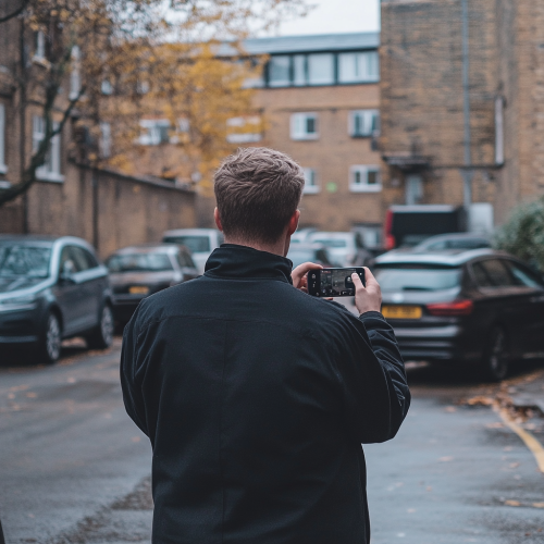 Amateur photo of the back of a man standing in front of a car in a parking lot in London, and taking a photo of the reg plate, back view of the man, natural light, amateur picture posted on Instagram Stories, taken with iphone 10