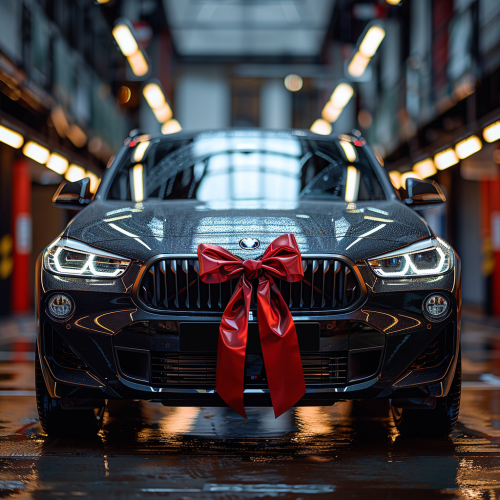 Dark Gray BMW X2 car with an ultra-huge red bow stands in a street parking lot, ultra-realism, ultra-realistic photo --v 6.0 --s 750