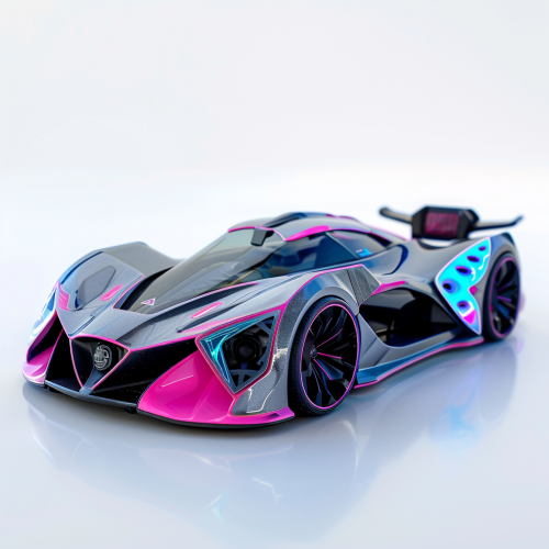 a futuristic, 1:43 scale, RC sports car with the control sitting behind it. It is primarily grey, but has pink and blue mr. beast accent graphics. it is sitting on a white background