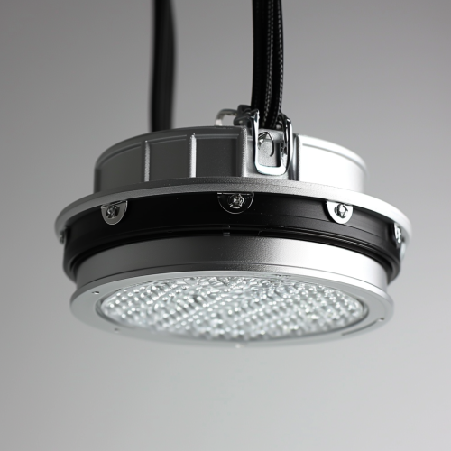 Industrial LED lamp with LED board, aluminum alloy housing, cooling fins , tempered glass diffuser, with metal cable glands --v 6.0 --ar 1:1