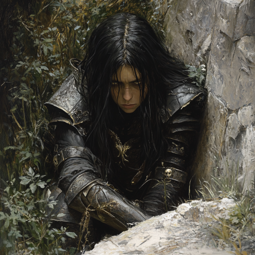 extremely detailed and realistic, grim dark gothic atmosphere, alan lee artstyle, female elf warrior hiding behind the stone in the bottom of the image, cold and terrible pine forest in the background, elegant and sophisticated black elf armor, scared in the shelter, hounting from the bushes, total black hair, extremely long black hair