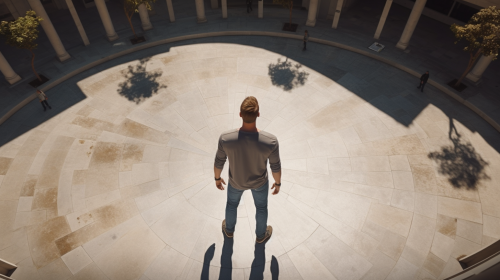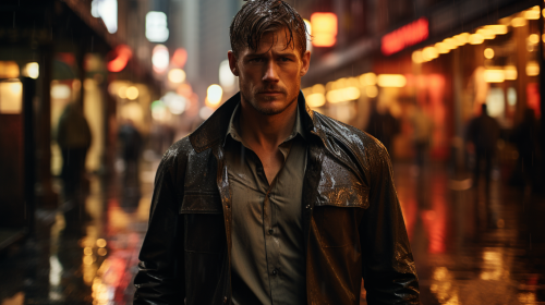 alan ritchson as a drifter, a phantom, in the shadows of society, the world moves around him, he is tall and wears a tshirt, his eyes watching, noir, cinematic, ultra real, photorealistic, 8K, --ar 16:9