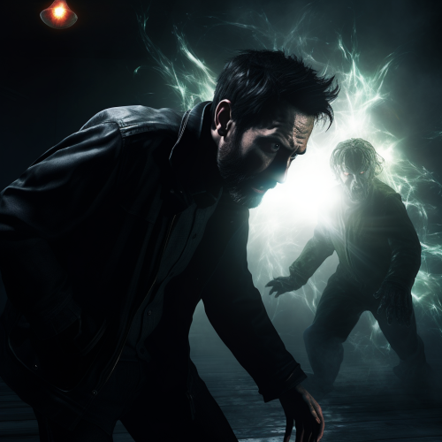 Craft a graphic that highlights the mystery and suspense surrounding Alan ritchson's allies and enemies, leaving viewers intrigued about the characters and their motives, cinematic, noir, realistic, 8K --ar 16:9