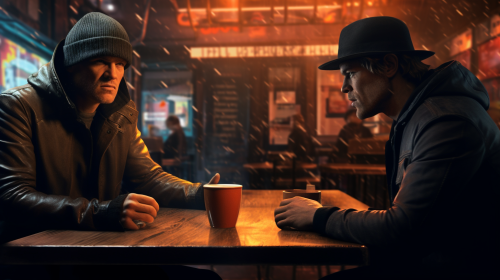 alan ritchson wearing a heavy coat over a tshirt meeting a detective discussing a case, cinenatic, noir, realistic, 8K --ar 16:9 --no neck tie
