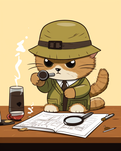 A black Scottie dog dressed as a detective, with a magnifying glass, investigating a case of missing dog treats. The background is a stylized, mystery-themed room with clues scattered around. --ar 9:16