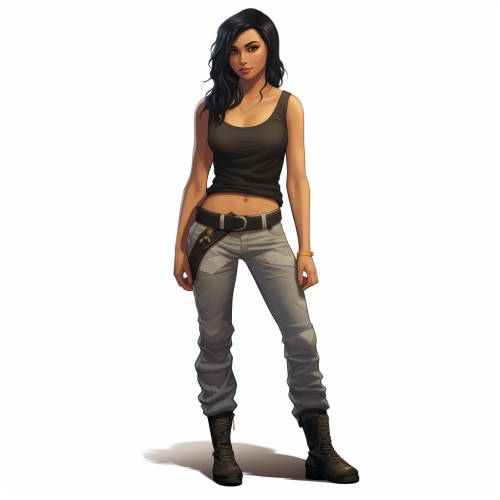 design of an albanian woman with black hair, brown eyes and white skin, wearing a black sleeveless shirt and jeans in a 16 bits video game style, full body