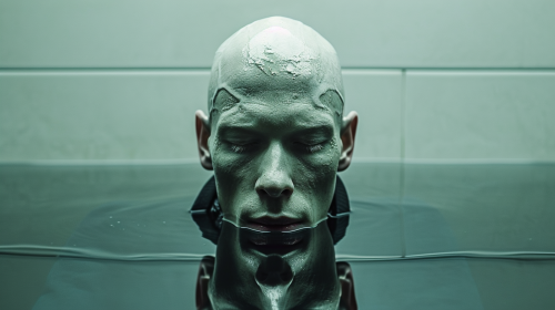 portrait photography of male android albino model floating in the water tank, capsule , in front a mirror, espejismo, mirror reflection, pieces of the alien insect muted , filmstill, nordic cinematic light, minimalistic background --ar 16:9 --style raw --stylize 250 --v 6.0