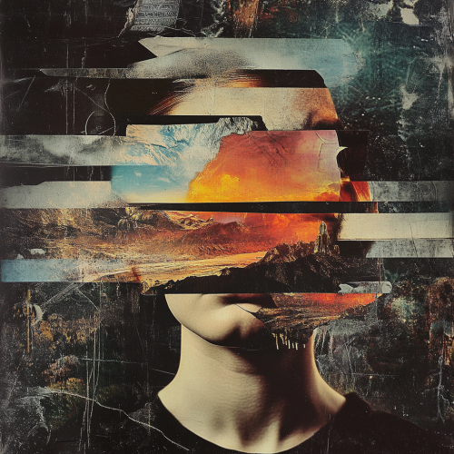 Create an album cover with layered imagery, such as a collage of different scenes or perspectives overlapping each other. Use a mix of textures and colors to represent the complexity and multifaceted nature of 'Visualize Reality.'