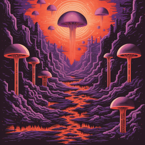 an album cover, space invaders, purple and orange predominant colors, woodblock print style