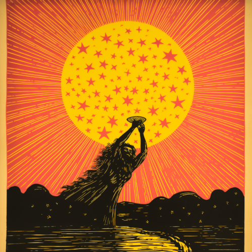 Etsy listing image, # E82565 hot pink image of shows a woman pouring water into a pool, symbolizing spiritual connection and renewal under a sky full of stars, representing hope and guidance. , backdrop yellow with a large star in the centre, # F5C81A background yellow, 2d, rider - waite woodblock printing, etching style, an album cover of tarot theme, exotic, coexistance, surreal, psychedelic, abstract, friendly, # F5C81A background, style of Pamela Colman Smith, 1900's, vintage quality print