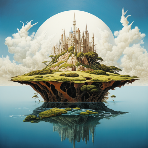 detailed high definition artwork for an album cover inspired by William Roger Dean of a rabbit on a floating on an island