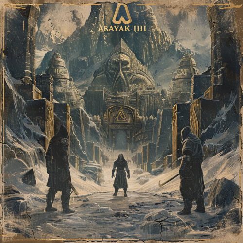 album cover that has "ARAYAK III" engraved in it, evil scenery, two men in all black in the background, beautiful, epic
