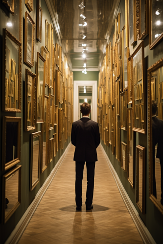 Lost Innocence. Content: A middle - aged man stands alone in a vast, empty playground. His attire is formal, contrasting with the playful surroundings. His face, etched with the lines of time and experience, holds a distant, contemplative expression. Behind him, a faded, almost ghostly image of his younger self plays on the swings, symbolizing the lost child within. Medium: Digital Photography. Style: Hyper - realistic, with a touch of surrealism to depict the ethereal image of his younger self. Lighting: Soft, melancholic twilight, casting long shadows and a gentle blue hue over the scene. Colors: Muted blues, grays, and hints of the golden remnants of sunset. Composition: Captured with a Canon EOS 5D Mark IV DSLR camera, EF 50mm f/ 1. 8 STM lens, Resolution 30. 4 megapixels, ISO sensitivity: 100, Shutter speed 1/ 125 second --ar 4:3