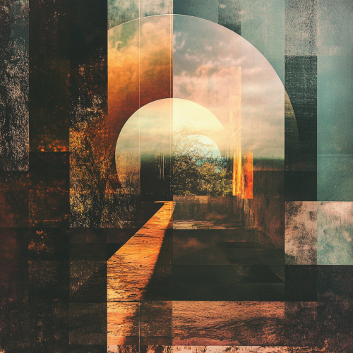 Design an album cover featuring a surreal landscape where dream-like elements blend with realistic ones. Include floating objects, distorted perspectives, and vivid colors to reflect the concept of visualizing and reinterpreting reality.