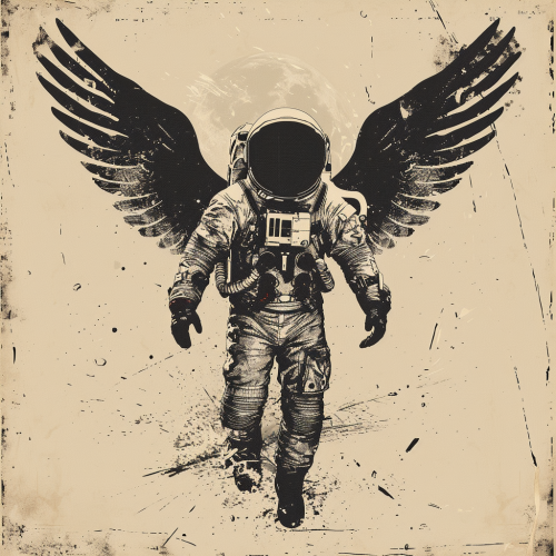a silhouette of an astronaut with wings for an album , screen printing style, collage, simplistic