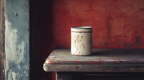 a can of white paint, on the corner of an atelier, in the 19th century Japan, looking sharp and dangerous, Henri Cartier-Bresson photography style, high contrast, color, Kodak tone, 8k --ar 16:9