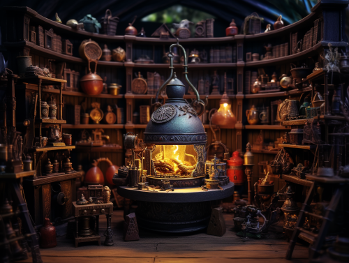 Inside view of the alchemist's atelier, Bookshelfs, big iron pot, laboratory equipment, witch's cauldron, Diorama style, blurry background, back light --ar 4:3