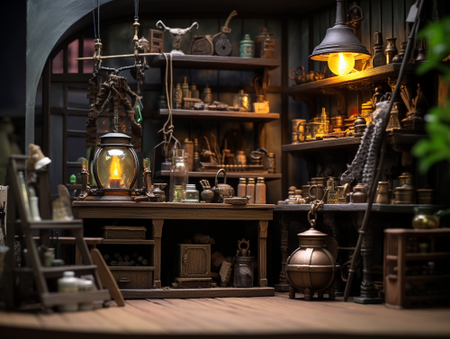 Inside view of the alchemist's atelier, Bookshelf, cauldron and laboratory equipment, Diorama style, blurry background, back light --ar 4:3