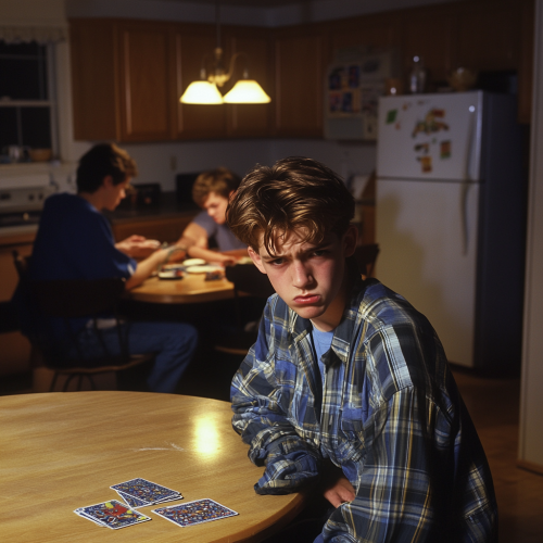 an upset skinny average looking 14 year old kid emptys a dishwasher in a texas 1990s suburban home while his friends play card games at the kitchen table in the background