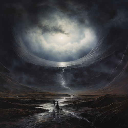 A man walking towards a massive black hole that. Huge rays of light rise above the water, with pink and red lightning painting the sky. The scene is heavy and bleak, blending dispair and hate. The scene has a grainy film effect, with hyper-realistic reflections on the water, capturing a love and dark aesthetic in style of wes anderson --chaos 22 --ar 1:1 --sref 2959860992 --personalize 7pfsx2n --sw 25 --stylize 1000 --v 6.1