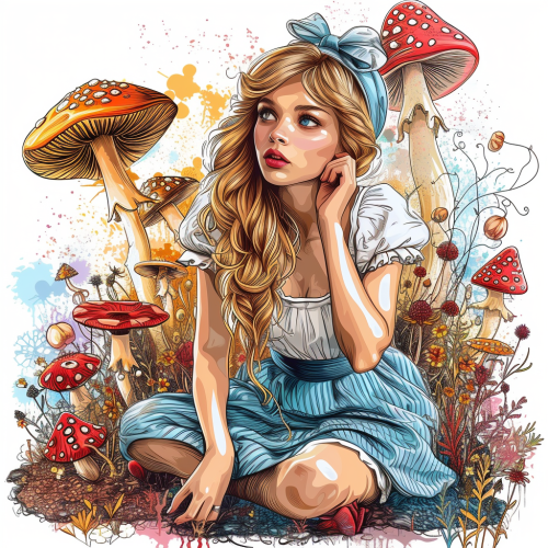 alice in wonderland, full body, bold outline, sticker art, detailed, vector, contour, bright colors, white background. --c 15 --v 6.0