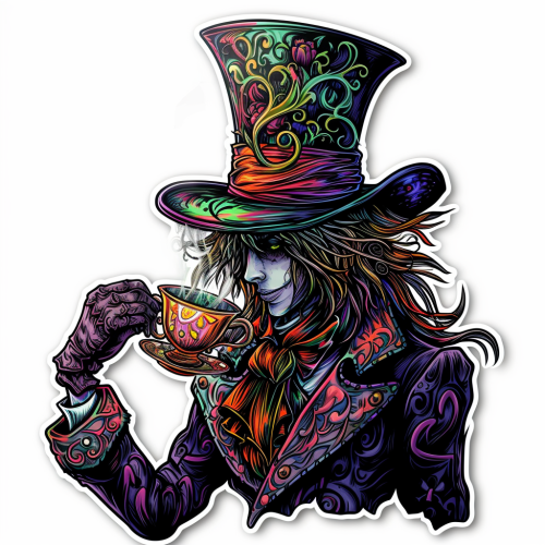 mad hatter drinking tea from alice in wonderland, vector, anime style, full body, bold outline, sticker art, highly detailed, 8k, bright colors, white background. --chaos 15 --v 6.0 --seed 1122260237