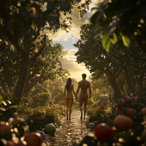 hyper realistic cinematic 16k Sony quality picture of Adam and Eve in the paradise relaxing looking on each other in the Paradise, highly detailed picture with highest resolution