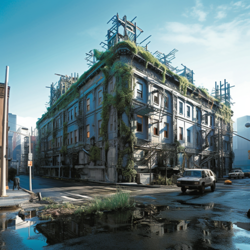 beautiful ruin of this building, enchanted ecology, spiritual https://s.mj.run/cQ5X70DSwRo cyberpunk style, dystopia, on water, polluted sky, during the day