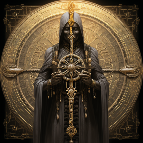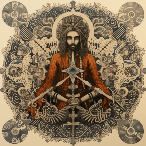 johova holding the key of solomon cross on his back, ancient alien civilization, kalamkari ,