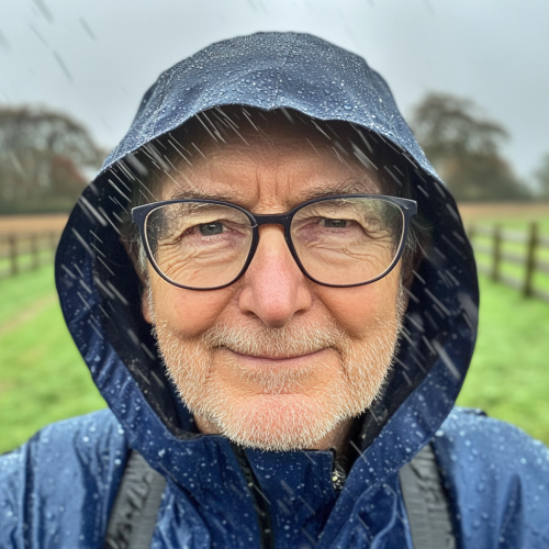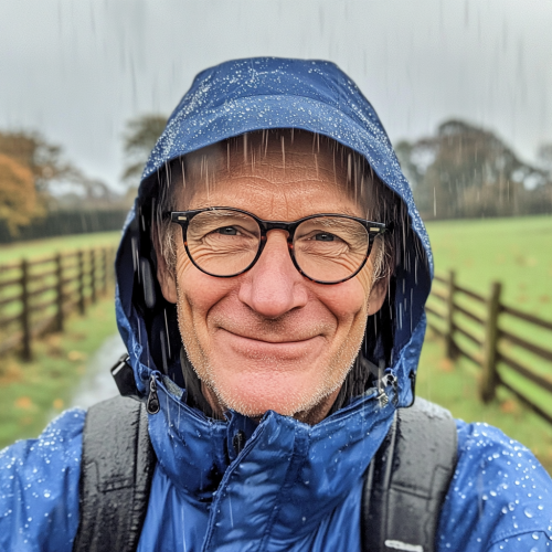 A wide-angle selfie of a 65 year-old man wearing glasses and a blue raincoat. In the background, there are green fields with wooden fences in the english countryside in fall. It's raining heavily, and his hair is covered in water droplets. He is smiling at the camera, and it appears to be very cold outside.