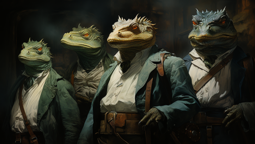 a group of scaly green alien lizard creatures are riding steampunk motorcycles across a lush Venusian countryside, style of nc wyeth, howard pyle, greg cupullo, lempicka --ar 30:17 --v 5.2 --s 750