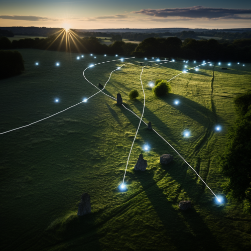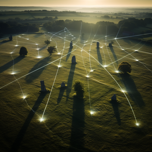 network of light on the surface of the ground connecting standing stones and churches in the English countryside, aerial view, light, lines, network