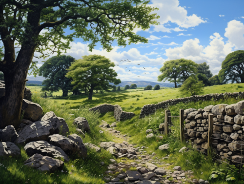 the finest English landscape, rolling hills, dry stone walls, woodland, summer, hyper realistic --ar 4:3