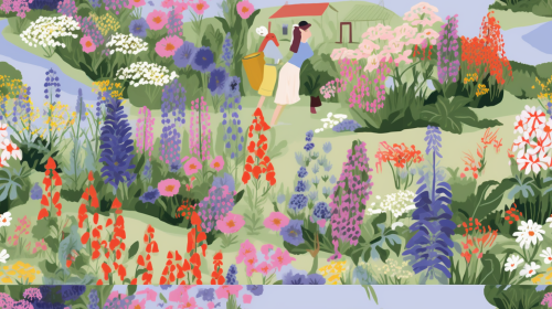 Gouache english garden illustrations, bold color palette,gouache, romanticized country life, --ar 16:9 --tile --style kfbUSyzE