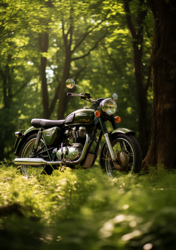 green royal enfield bullet in the english countryside with greenery and sunlight --ar 297:420