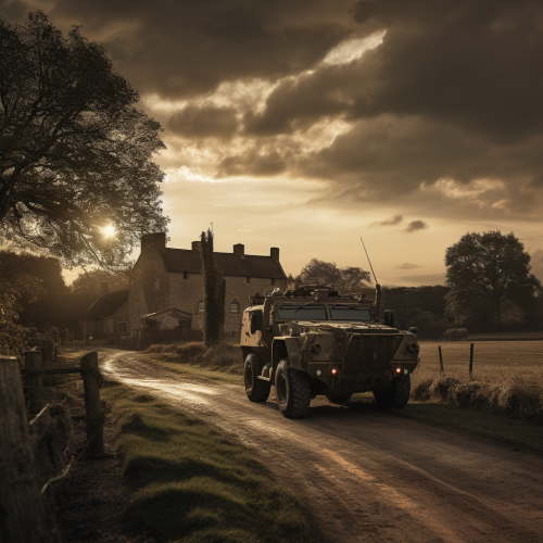 photograph of heavily guarded military compound, English countryside, sunset, armored vehicle in foreground
