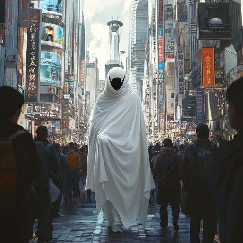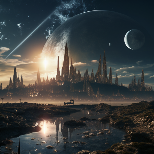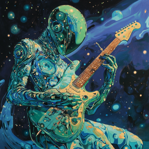 A surreal creature standing in an alien landscape. The creature has a humanoid shape with colored tentacles wrapping around its body. The head is decorated with glasses and a fancy headdress. The skin is almost synthetic, contrasting with the tones of the tentacles and surroundings. The sky is shown in the background. It’s a joy to stand in front of a majestic planet that hangs in the sky, tentacles crumbling smoothly around it, mutely alive. Its head is topped with a drop, which resembles a flower as it gradually changes shape. The overall atmosphere is a mixture of science fiction and fantasy with a touch of surrealism and psychedelia.
