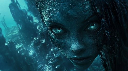 close up shot of Alien Mermaid living under water in huge underwater city with thousands of others, otherworldly looking, slightly scary, biology and technology combined. --ar 16:9 --q 2