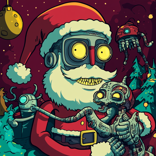A character that looks like Santa Claus, illustrated in the exact style of Matt Groening, with flat colors and bold black outlines, closely resembling Fry from Futurama. The character is half Santa, half robot, with mechanical parts integrated into his body. He is holding an alien dog with tentacles, reminiscent of Zoidberg from Futurama, but still distinct and unique. The scene has a vibrant, cartoonish feel, maintaining the humorous and quirky aesthetic of Groening's animated shows.