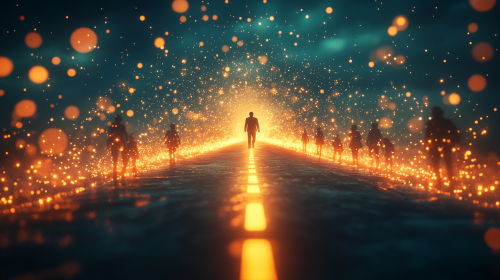 Step to 2024: (The last part about achieving success) Theme: Success, self-confidence, and leadership. Image: A road surrounded by bright lights, a person moving towards the horizon, the traces left behind represent success. You can see people following but not finding the same light. Instruction: You can use an illuminated path in front of a person and characters behind him/her trying to follow his/her trail but not reaching it. --ar 16:9