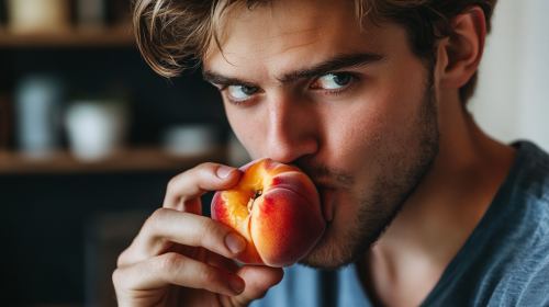 a man taking a bite out of a peach with the pit visible inside the peach, straight on looking ahead, peach, smart casual, natural light, bright, --ar 16:9