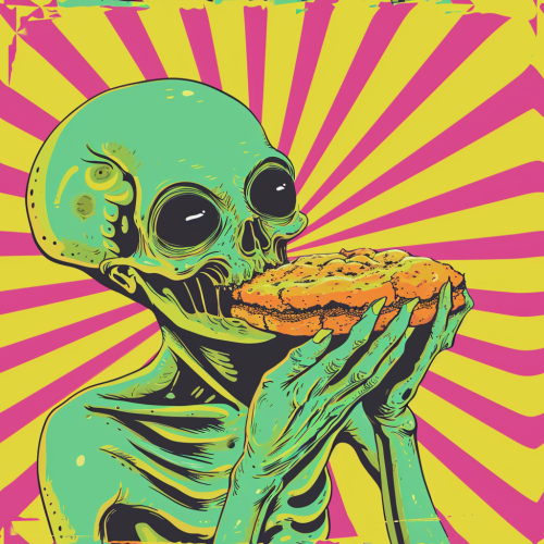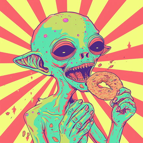 an alien eating a cookie. the cookie looks like a person. background is bright. color palette is in the style of wes anderson --tile --s 50 --v 6.0