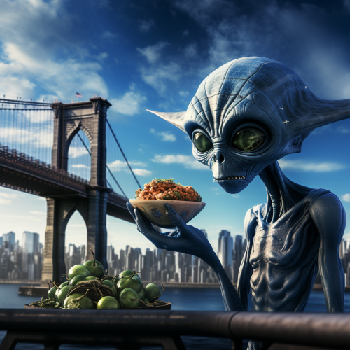 a happy alien eating a human-shaped cookie. background is bright. color palette is in the style of wes anderson --style raw --s 50 --v 6.0