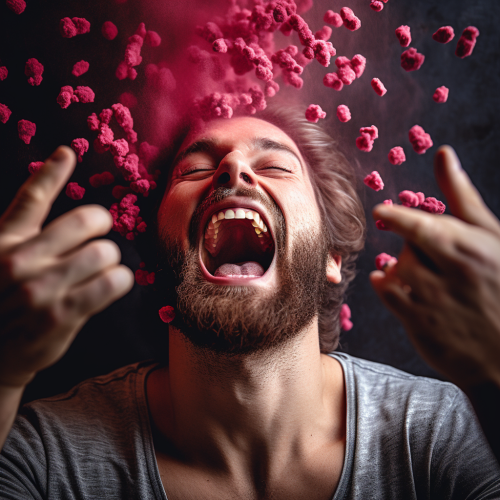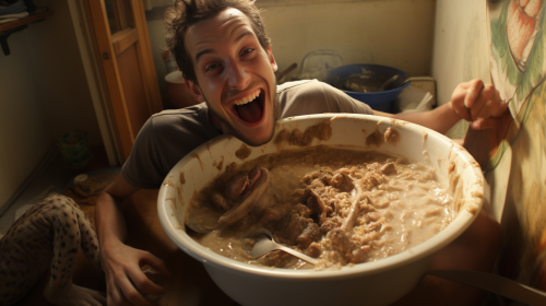 happy person eating from large bowl on the kitchen floor, smiling, hyper realistic, --ar 16:9