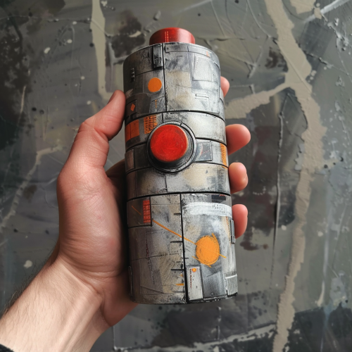 grey alien looking into hands, holding a glowing bright levitating microchip in shape of a large X, UFO and 2 rivers in background in style of psychedelic matt furie