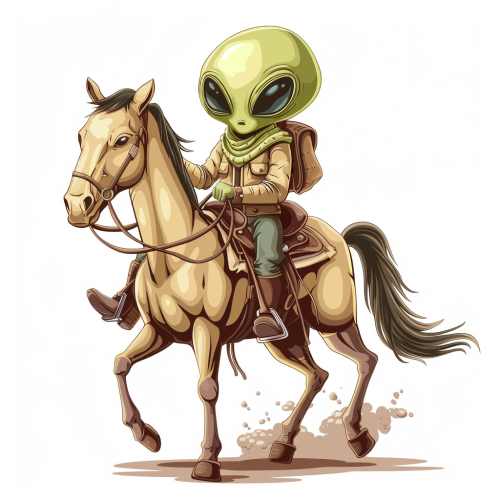 green alien riding a horse isolated on white background, funny cartoon --s 250 --v 6.0