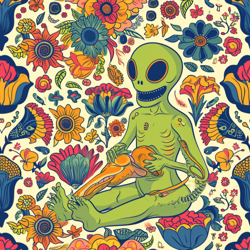a floral pattern of a happy alien eating a miniature human body. background is bright. color palette is in the style of wes anderson --tile --s 50 --v 6.0