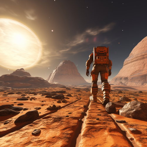 the first person stepping foot on mars, alien shadow in backgroud, scenic background, high detail, realistic,--ar 16:9,--v 6.0